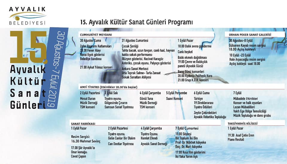 Ayvalık Belediyesi tarafından organize edilen 15.Kültür Sanat Günleri, 30 Ağustos 8 Eylül tarihleri arasında gerçekleştirilecektir.